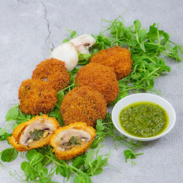 פטריות ממולאות בעשבי תיבול צנוברים גבינות עיזים מצופים בפנקו עם רוטב פסטו מתאים לקבלת פנים אירועי קוקטייל